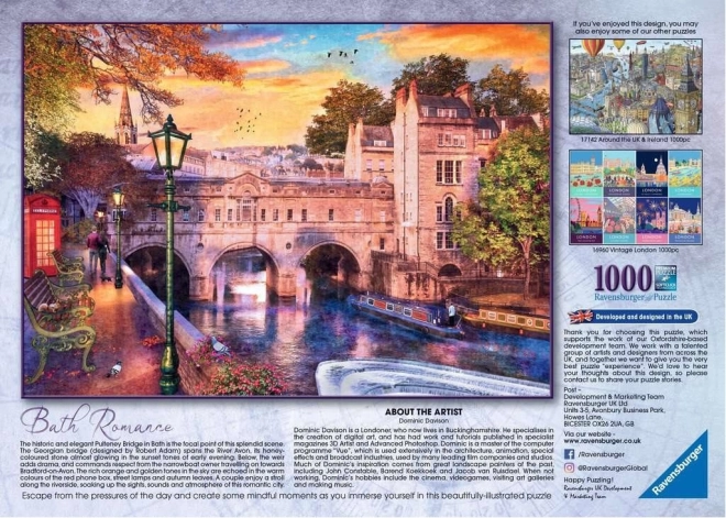 Odkryj urok relaksującej atmosfery z puzzlami RAVENSBURGER Uzdrowiskowa romantyka z 1000 elementami. Dzięki precyzyjnemu wykonaniu, wysokiej jakości tekturze i dokładnemu wykrojowi elementy doskonale do siebie pasują, a gotowy obraz o wymiarach ok. 70 × 50 cm zachwyci każdego miłośnika puzzli. Idealne na spokojne wieczory i jako stylowa dekoracja po sklejeniu. 1000 elementów, jakość premium RAVENSBURGER, wymiar 70 × 50 cm.