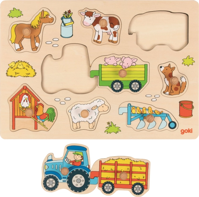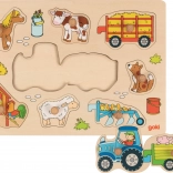Kolorowa drewniana układanka z motywem farmy i traktora ucieszy najmłodsze dzieci. Zawiera dziewięć elementów z praktycznymi uchwytami ułatwiającymi manipulację i trenuje małą motorykę, koordynację oko–ręka oraz logiczne myślenie. Dzięki drewnianej podstawie i ramkom elementy stabilnie trzymają się na swoim miejscu. Odpowiednia dla dzieci od 1 roku.