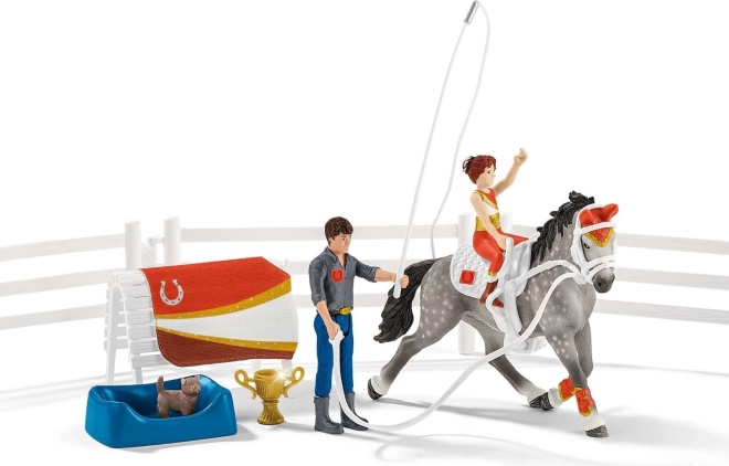 - Kompletny zestaw do woltyżerki: koń, amazonka Mia, trener Tom, zagroda, siodło, uzda, nachrapniki/martingale, lina i bat.