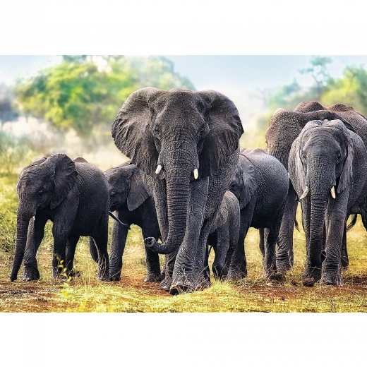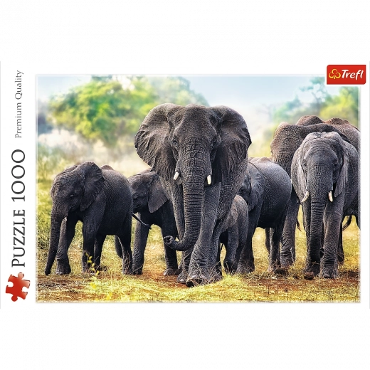 Puzzle TREFL 1000 elementów z motywem afrykańskich słoni. Wymiary 68 × 48 cm, błyszcząca powierzchnia, intensywne kolory i bezpieczne ekologiczne farby dla wygodnego układania.