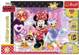 Puzzle Minnie i Brokat oferują 100 elementów zabawy dla wszystkich fanów Myszki Miki. Każdy element jest ozdobiony delikatnym złotym brokatem.