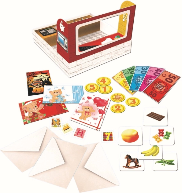 - Okienko pocztowe, lada, 2 kasy, 58 klocków z obrazkami, 30 banknotów, 8 monet, 12 pocztówek, 10 kopert, 48 znaczków