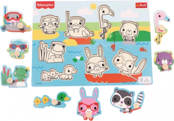 Dzięki kolorowym konturom na podstawce dzieci mogą łatwo znaleźć właściwe miejsce dla zwierzątka, co czyni je podekscytowanymi odkrywcami. W zestawie znajdują się zwierzątka takie jak szop, flaming i kaczuszka, co jeszcze bardziej wzmaga zabawę.