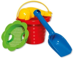 W komplecie znajduje się wiaderko o wysokości 11 cm, łopatka, foremka i sito – podstawowy zestaw do budowania zamków, tworzenia kształtów i przenoszenia piasku. Kolorystyka może się różnić, co sprawia, że każdy zestaw jest wyjątkowy.