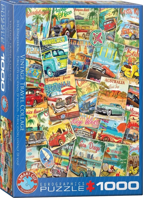 Ciesz się sprytną rozrywką z puzzlami EUROGRAPHICS z motywem retro podróżniczej kolaży o 1000 elementach. Dzięki unikatowej wykrojnikowi elementy mają nietypowe kształty, co zwiększa trudność i frajdę. Po ułożeniu powstanie obraz o wymiarach ok. 48 × 68 cm – idealny do oprawienia w ramę.