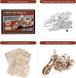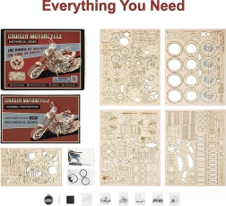 Odkryj radość z modelarstwa dzięki precyzyjnej, drewnianej, trójwymiarowej układance motocykla ze sklejki. Model oferuje nakręcany sprężynowy napęd, funkcyjne sterowanie, ruchome tłoki oraz działające przednie zawieszenie. Dzięki 420 elementom i średniemu poziomowi trudności czekają Cię 4–5 godzin zabawy; po złożeniu motocykl jest zdolny do samodzielnej jazdy i zachwyca dekoracyjnym wyglądem oraz drobnymi schowkami przy siodle.