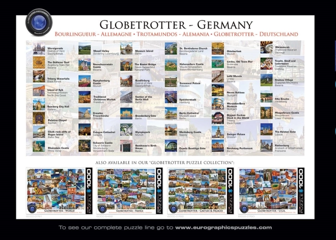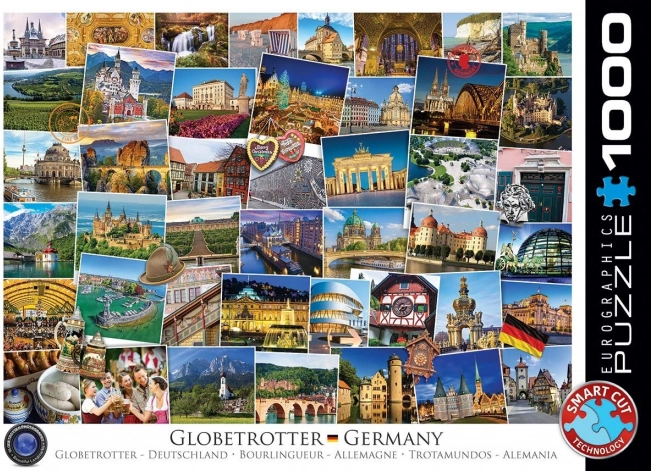 Odkryj piękno Niemiec z wysokiej jakości puzzlami EUROGRAPHICS z 1000 elementami. Dzięki unikalnej wykrojnicy o nieregularnych kształtach układanie jest wyzwaniem, a zarazem świetną zabawą. Wymiary po ułożeniu to ok. 68 × 48 cm. Oryginalne kształty elementów, wyższy poziom trudności oraz szczegółowa mapa Niemiec ucieszą każdego miłośnika puzzli i podróży.