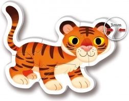 Ten zestaw zawiera cztery oddzielne puzzle z motywami ulubionych zwierząt safari. Dzięki różnej liczbie elementów (2, 3, 4 i 5) dziecko stopniowo nabiera pewności i radości z układania. Duże, solidne elementy o grubości 3 mm są dostosowane do małych dziecięcych rączek i łatwe w manipulacji.