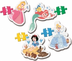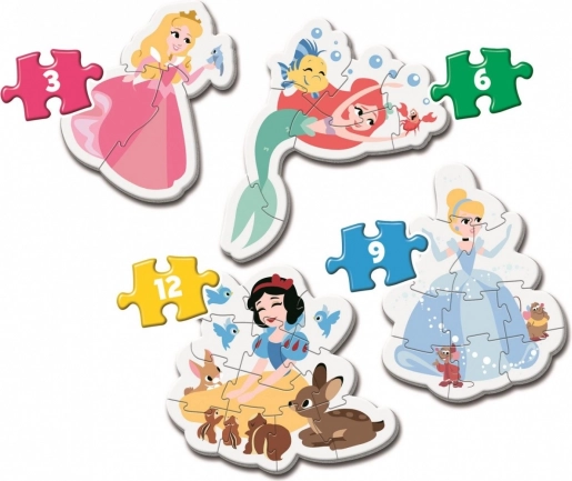Z tym zestawem Moje pierwsze puzzle dzieci będą się świetnie bawić, układając obrazki z ukochanymi bohaterkami bajek DISNEY. Cztery różne poziomy trudności (3, 6, 9 i 12 elementów) umożliwiają naturalny postęp i wzmacniają pewność siebie przy każdym ukończonym obrazku. Dzięki ekstra dużym i grubym elementom (3 mm) puzzle łatwo trzymać nawet najmniejszym rączkom.