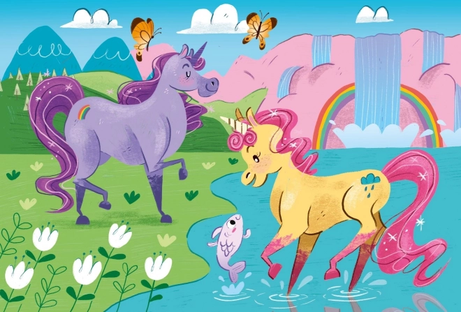 Uroczy zestaw dwóch dziecięcych puzzli CLEMENTONI z motywem jednorożców oferuje 2×20 elementów do radosnego układania. Dzięki błyszczącej warstwie z diamentowym efektem każdy obrazek lśni, a żywe kolory SuperColor pozostają piękne przez długi czas. Puzzle rozwijają sprawność manualną i spostrzegawczość i są odpowiednie od 3 lat. Wymiary ułożonego obrazka to ok. 27 × 19 cm.
