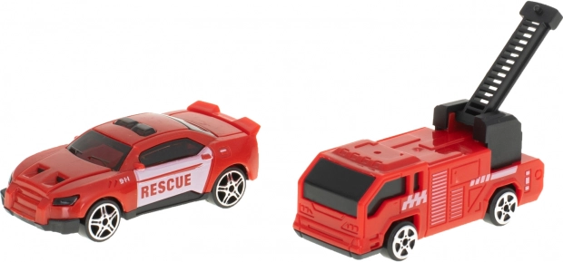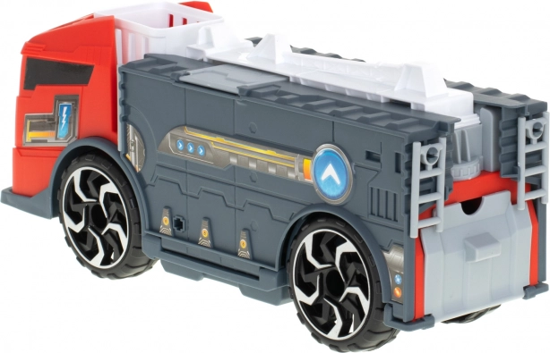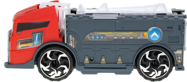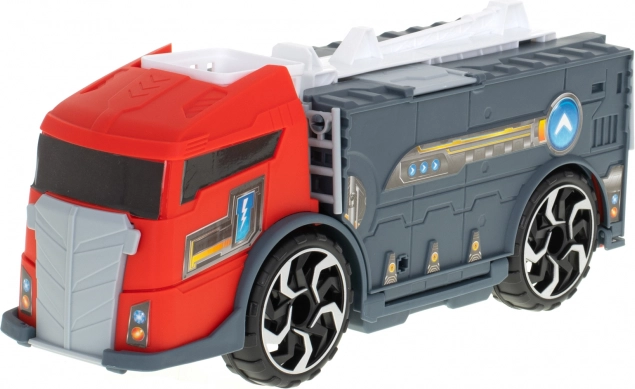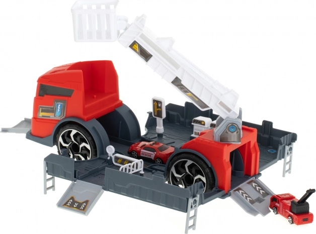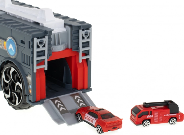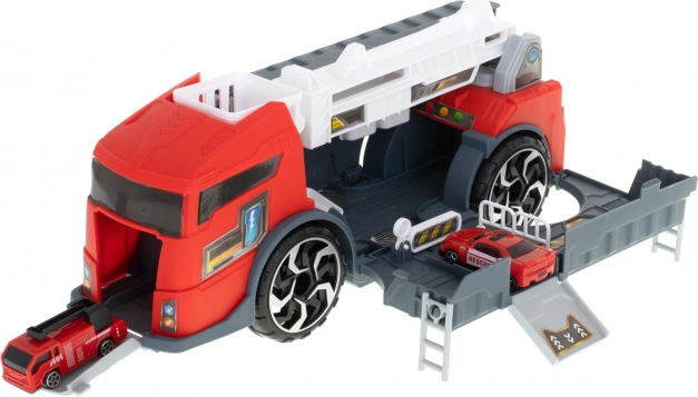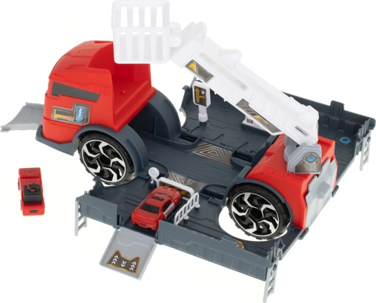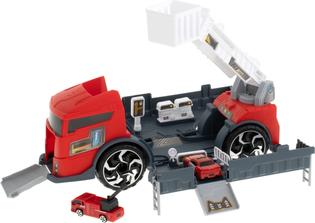 Wóz strażacki działa jako transporter, który przewozi dołączone modele autek z pomocą rampy.
