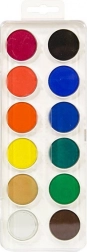 Plastikowa prostokątna kasetka jest lekka, wytrzymała i praktyczna w przenoszeniu do szkoły lub pracowni. Zestaw 12 kolorów obejmuje podstawową paletę do malowania na papierze, kartonie czy blokach akwarelowych.