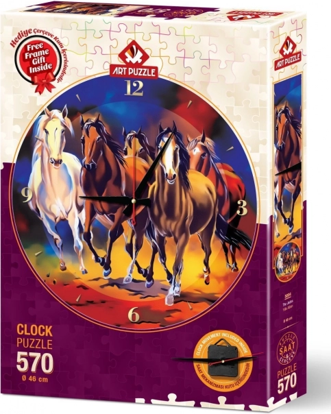 Montaż jest prosty: po przyklejeniu puzzli do dołączonej podkładki złóż ramę, włóż motyw, zamocuj klipsy i zamontuj mechanizm zegarowy. Efektem jest dekoracyjny zegar o średnicy ok. 46 cm, który ucieszy miłośników koni i puzzlowych wyzwań.