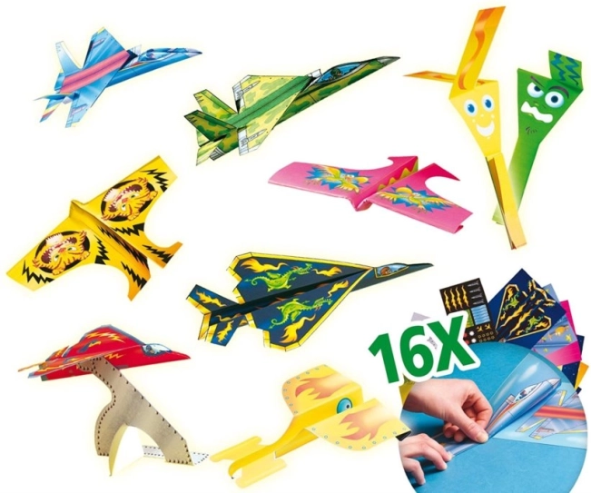 - Arkusze papieru do wykonania aż 16 samolotów, naklejki do ozdabiania