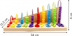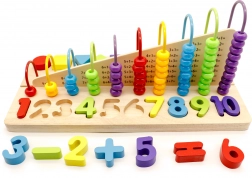 W skład zestawu wchodzi drewniana tablica z operacjami dodawania i odejmowania. Przesuwanie koralików z jednej strony na drugą pozwala dziecku osiągnąć wyniki, co jest doskonałym sposobem na naukę rozwiązywania prostych równań.