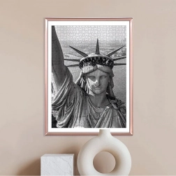 Detalicznym ujęciem głowy i korony Statuy Wolności można się zachwycać dzięki kontrastowi i precyzyjnemu drukowi – idealne dla miłośników designu i fotografii.