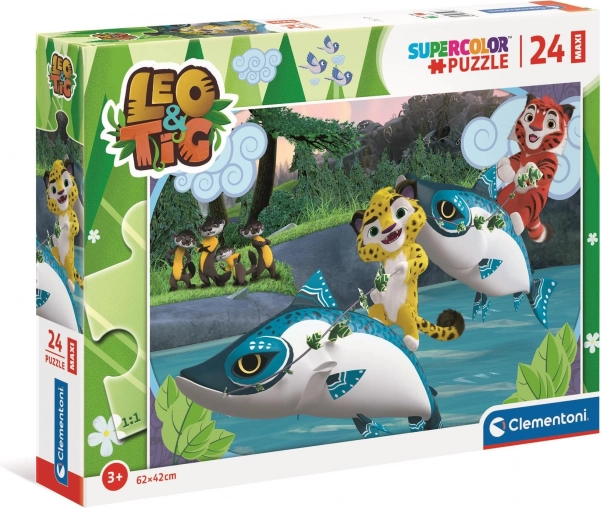 Odkryj zabawne puzzle dla dzieci z motywem LEO I TIG w ekstra dużym formacie MAXI. Układanka z 24 dużymi elementami jest idealna dla maluchów, wspiera motorykę małą, myślenie logiczne i percepcję barw. Po ułożeniu powstaje obrazek o wielkości ok. 62 × 42 cm z żywymi kolorami i wesołymi zwierzęcymi bohaterami.