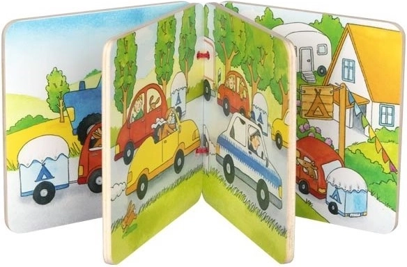 Drewniana książeczka „Jedziemy na wakacje” marki GOKI zaprasza dzieci do odkrywania świata podczas rodzinnej wyprawy. Na solidnych drewnianych stronach znajdą 8 ilustrowanych obrazków, które opowiadają historię z perspektywy małego czerwonego auta. Dzieci mogą porównywać fabułę z tym, co widzą wokół, zadawać pytania i naturalnie rozwijać słownictwo.