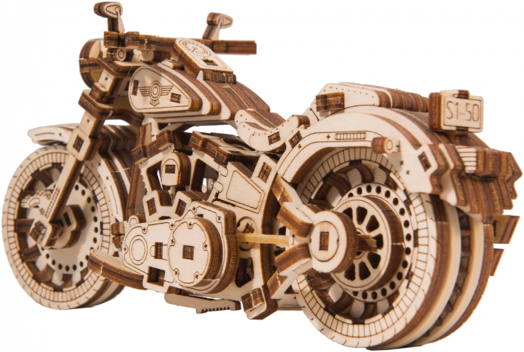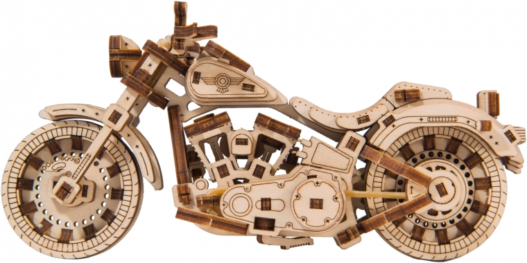 Drewniany mechaniczny zestaw najwspanialszego motocykla Cruiser V‑Twin czeka na Ciebie! Dzięki unikalnemu designowi i zaskakującym detalom tego modelu spędzisz czas pełen zabawy i świetnych emocji. Możesz sterować za pomocą przedniego koła. Motocykl z mechanizmem bezwładnościowym może przejechać do 1 metra. Zachwycą Cię ruchome cylindry podczas obracania tylnego koła, a także amortyzatory w przednim widelcu motocykla. Cruiser V‑Twin jest wyposażony w tarcze hamulcowe i ogumowane koła.
