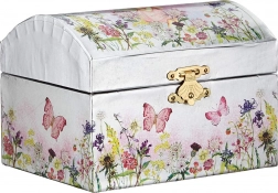 Ta szkatułka w stylu pozytywki łączy czarujący wygląd z funkcjonalnością. Srebrzyste wykończenie z połyskiem uzupełniają subtelne motywy kwiatów i motyli, wewnątrz znajduje się owalne lusterko i obrotowa baletnica. Po otwarciu wieka rozbrzmiewa słynna melodia Jeziora łabędziego, która towarzyszy każdemu odkładaniu pierścionków czy kolczyków w bezpieczne miejsce.