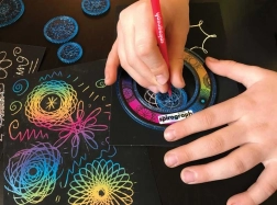 Obsługa jest prosta: wybierz podkład, włóż szablon, prowadź rysik po obwodzie i obserwuj, jak pojawiają się kolorowe linie. Zestaw idealny do tworzenia w domu, na prezent i do relaksu.