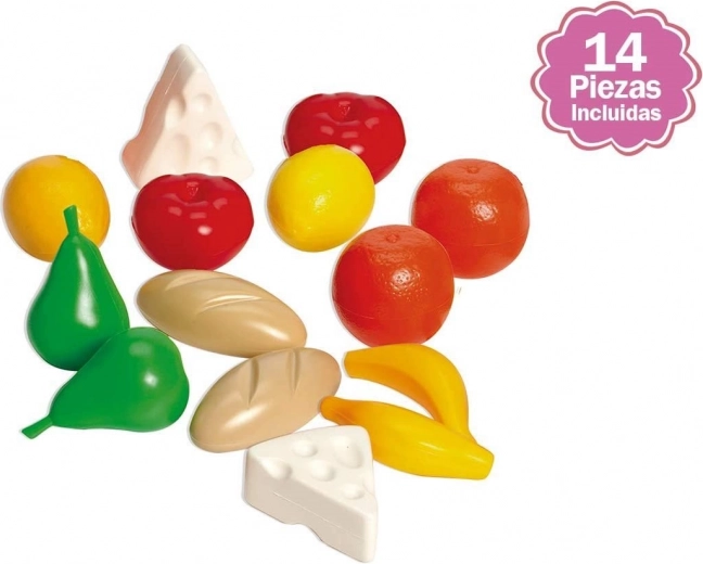 W zestawie znajdują się plastikowe produkty spożywcze, w tym owoce (gruszki, jabłka, banany) oraz inne elementy do urozmaiconej zabawy.