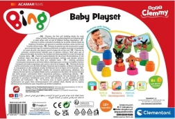 Połączenie opowieści z obrazkami, narracją i układaniem wspiera dziecięcą wyobraźnię, rozwija zmysły, zręczność manualną i orientację przestrzenną. Książeczka z twardego kartonu z Bingiem i Sulą (10 x 10 x 1,5 cm) z kółkiem do zawieszenia, 2 figurki: Bing + Sula (można nakładać na klocki), 8 miękkich klocków CLEMMY.