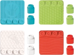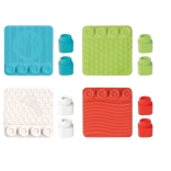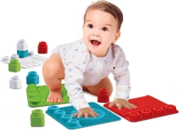 Każda mata ma cztery miejsca na klocki, dzięki czemu dzieci mogą tworzyć kolorowe kombinacje, układać, burzyć i budować na nowo. Miękki, testowany i bezpieczny materiał sprzyja dziecięcej eksploracji i jest łatwy w utrzymaniu: maty i klocki można myć w zmywarce do 30 °C.