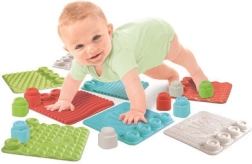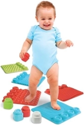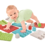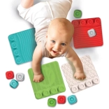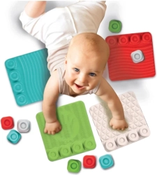 Cztery kolorowe maty z odmiennymi reliefami zachęcają dzieci do eksplorowania dotykiem, raczkowania i pierwszych prób równoważnych.