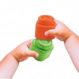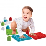 Osiem miękkich klocków łatwo chwytać i osadzać w miejscach na matach – idealne do ćwiczenia małej motoryki i koordynacji oko–ręka.