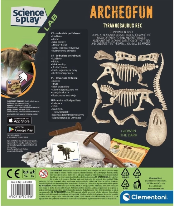 Zostań małym paleontologiem z edukacyjnym zestawem CLEMENTONI Archeo Fun: T‑Rex! Za pomocą dołączonych narzędzi wykopiesz i złożysz świecący szkielet T‑Rexa, odkryjesz tajemnice skamieniałości i ożywisz dinozaura w aplikacji z rozszerzoną rzeczywistością. Świetna zabawa, która rozwija zwinność, kreatywność i zainteresowanie nauką.
