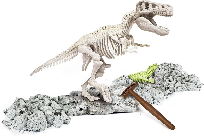 W skład zestawu wchodzi blok „ziemi”, młoteczek i dłutko. Dzieci spróbują prawdziwych wykopalisk, a następnie z odnalezionych elementów złożą szczegółowy szkielet T‑Rexa.