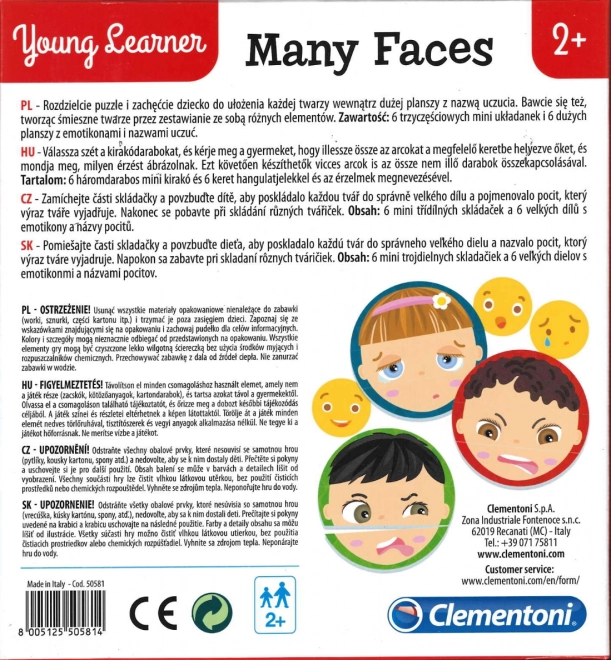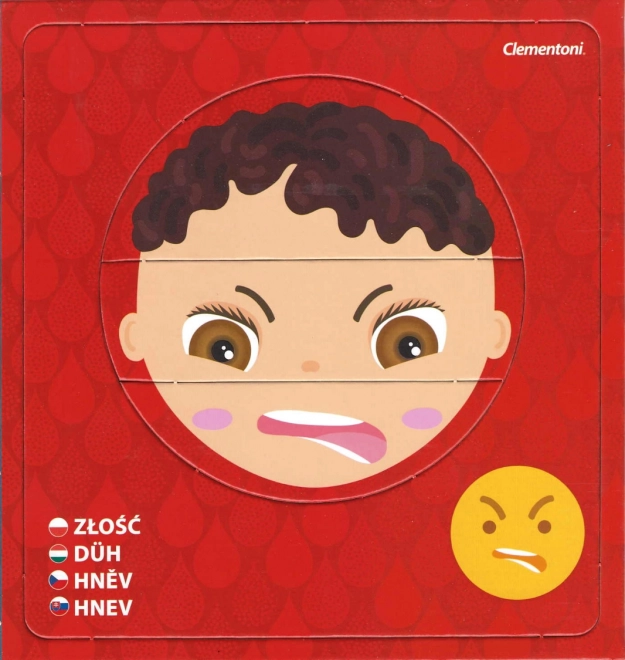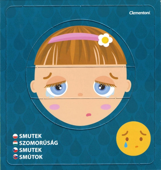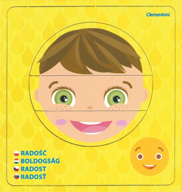 Odkryj świat emocji z dziecięcymi puzzlami CLEMENTONI Young Learner. Każdy z 6 obrazków składa się z 3 elementów i przedstawia inny nastrój z nazwą uczucia oraz odpowiednim emotikonem. Dzieci mogą układać twarze samodzielnie lub wkładać je w ramki, dzięki czemu w formie zabawy ćwiczą rozpoznawanie wyrazów twarzy.