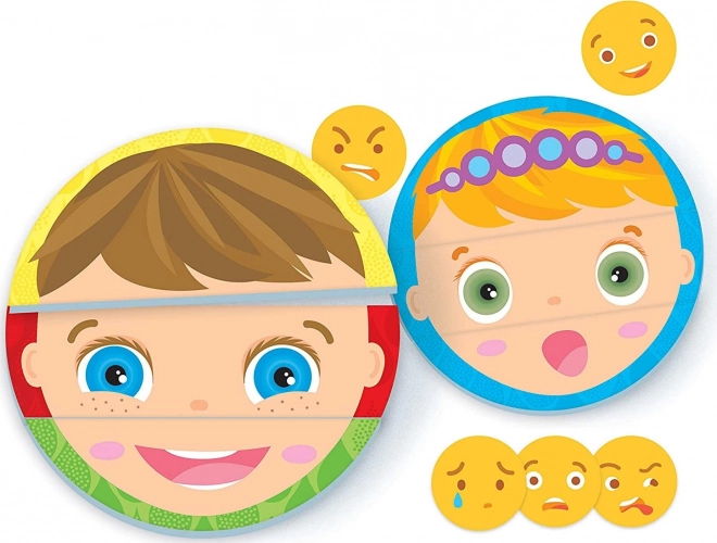 Zabawne edukacyjne puzzle dla najmłodszych, które pomagają dzieciom rozpoznawać emocje i mimikę. Opakowanie zawiera 6 obrazków po 3 elementy z nazwami uczuć i odpowiadającymi im emotikonami. Nauka emocji poprzez zabawę, trening koncentracji oraz rozwój motoryki małej w jednym.