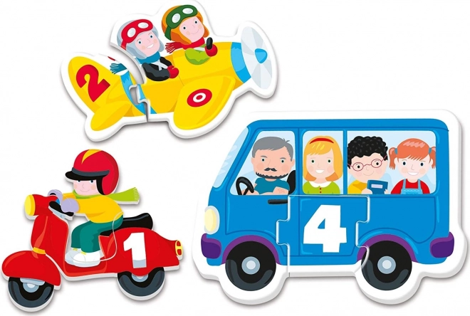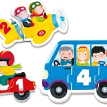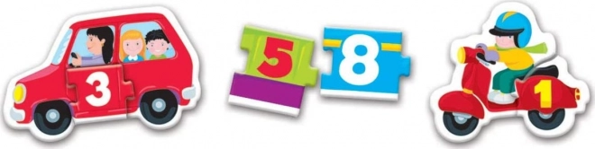 Ten kolorowy zestaw puzzli jest idealny do pierwszej nauki liczb. Dzieci najpierw policzą pasażerów w zabawnych środkach transportu, a następnie dopasują właściwy element z liczbą. Intuicyjne dopasowywanie po obrysie pomaga szybko zrozumieć związek między ilością a cyfrą.
