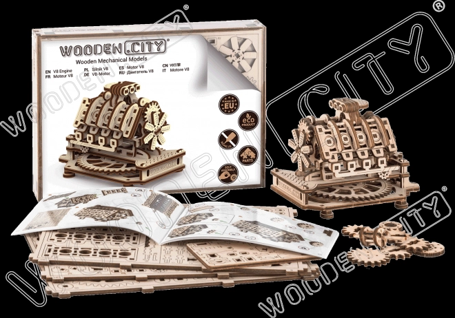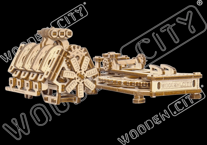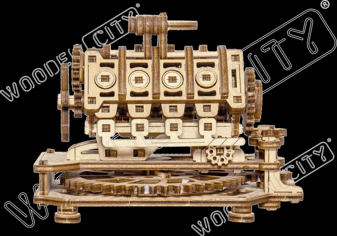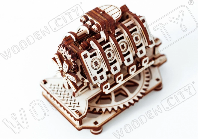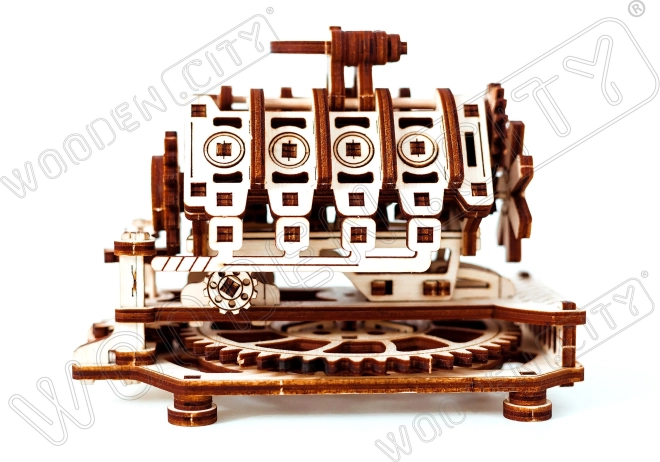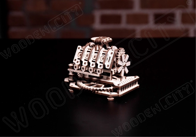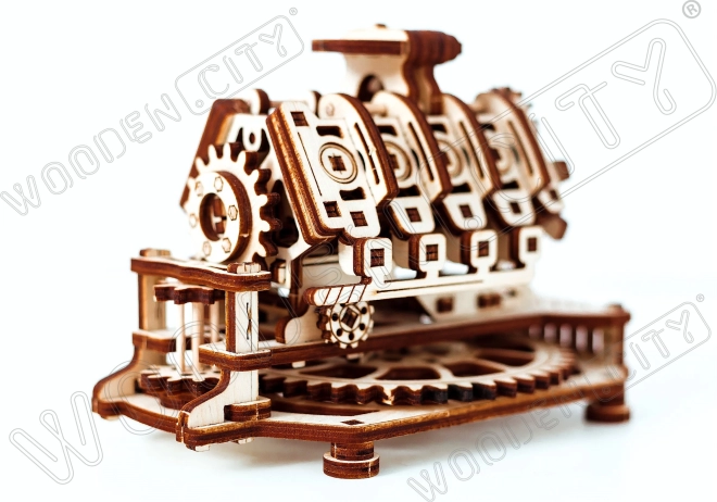 Drewniane puzzle 3D silnik V8 z ruchomymi tłokami i wałem korbowym. 200 elementów, średni poziom trudności, montaż bez kleju. Świetny prezent dla fanów techniki.