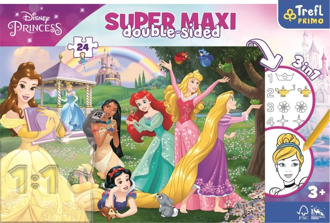 Dwustronne puzzle Super Maxi zapewniają dzieciom podwójną porcję zabawy. Jedna strona oferuje kolorowy motyw z księżniczkami DISNEY PRINCESS i 24 dużymi elementami, które łatwo układa się małym rączkom. Druga strona służy jako kolorowanka oraz prosta aktywność z liczeniem, wspierająca myślenie logiczne i koordynację oko–ręka.