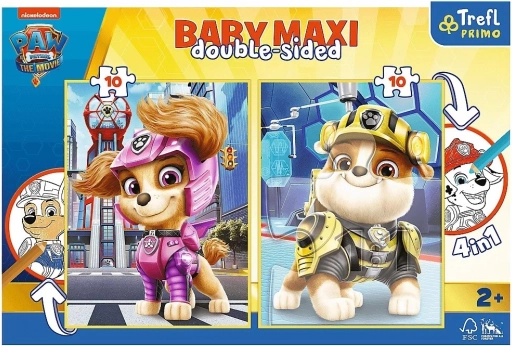 Ten zestaw dwustronnych puzzli Baby Maxi oferuje małym fanom PSIEGO PATROLU aż cztery sposoby zabawy w jednym produkcie. Dwie kolorowe układanki po 10 dużych elementów są idealne dla małych rączek i wspierają rozwój koordynacji oko–ręka. Na odwrocie każdej układanki znajduje się duża kolorowanka z ulubionymi bohaterami z filmu.