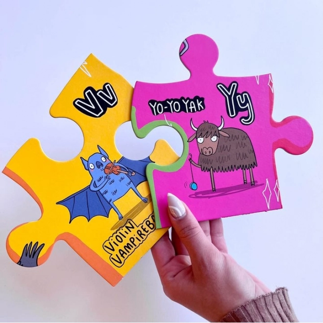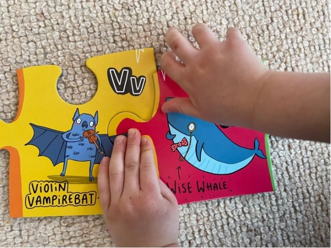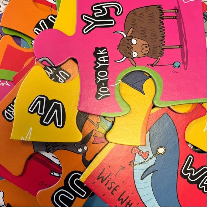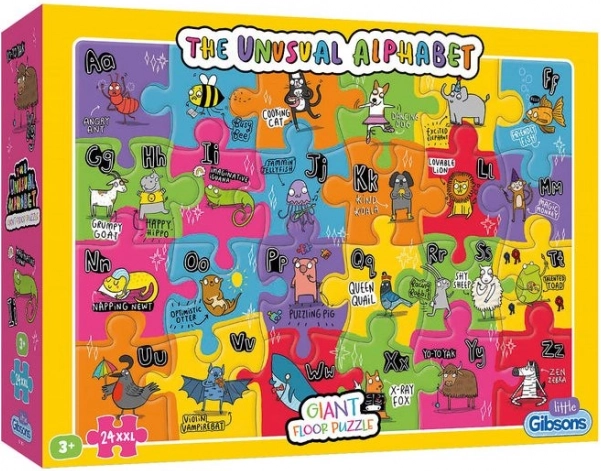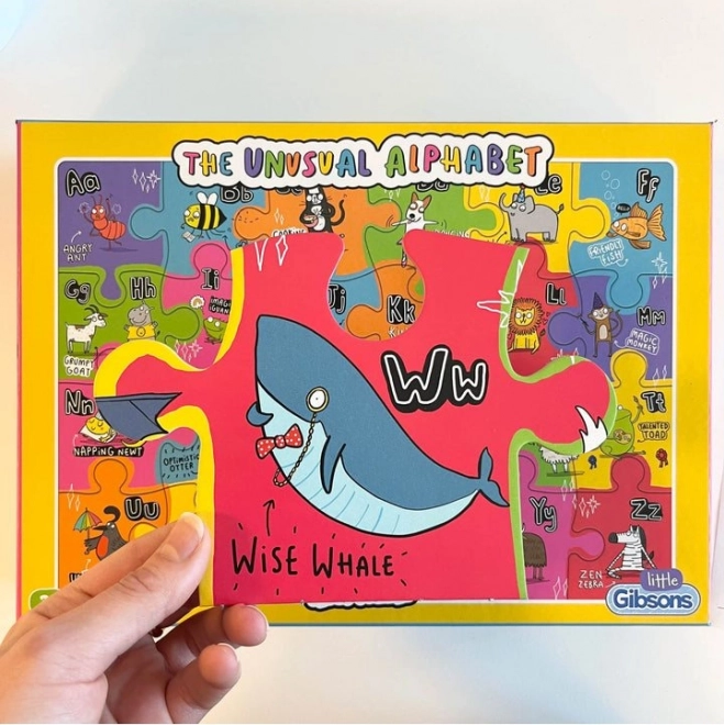 Odkryj świat liter i zwierząt z Gibsons puzzle Nietypowy alfabet. Doskonałe narzędzie edukacyjne, które łączy naukę z zabawą. Każdy element jest na tyle duży (14x19 cm), że można go łatwo chwycić, i ozdobiony żywymi obrazkami.