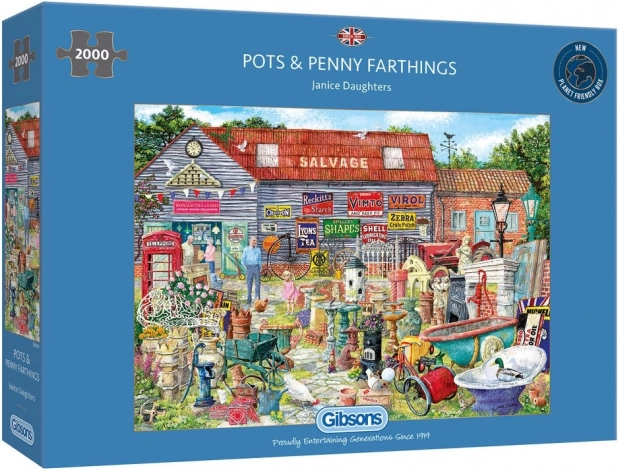 Odkryj urok nostalgii z dużymi puzzlami od Gibsons – Garnki i starocie za grosze o 2000 elementach. Czeka na Ciebie szczegółowo zilustrowana scena z podwórka pełnego skarbów, która zachwyci miłośników antyków i wymagających układaczy. W zestawie znajduje się arkusz z wzorem, a po ułożeniu powstanie wysokiej jakości, wielkoformatowy obraz o wymiarach 98 × 68 cm.