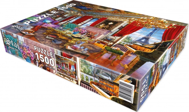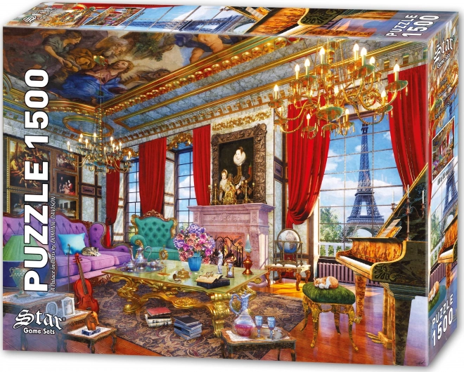 Luksusowo zdobione wnętrze z widokiem na Wieżę Eiffla tworzy niepowtarzalną atmosferę i bogatą wizualnie scenę, która bawi podczas układania i świetnie prezentuje się po oprawieniu w ramę.