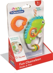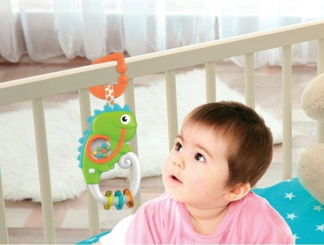 Zabawna interaktywna grzechotka w kształcie wesołego kameleona ucieszy najmłodsze dzieci w domu i w podróży. Można ją łatwo zawiesić na łóżeczku, wózku lub foteliku samochodowym. Oferuje efekty świetlne i dźwiękowe z melodiami, grzechoczące kuleczki i kółeczka do stymulacji zmysłów oraz rozwój małej motoryki. Wykonana z wysokiej jakości, bezpiecznych materiałów do pierwszego odkrywania świata.