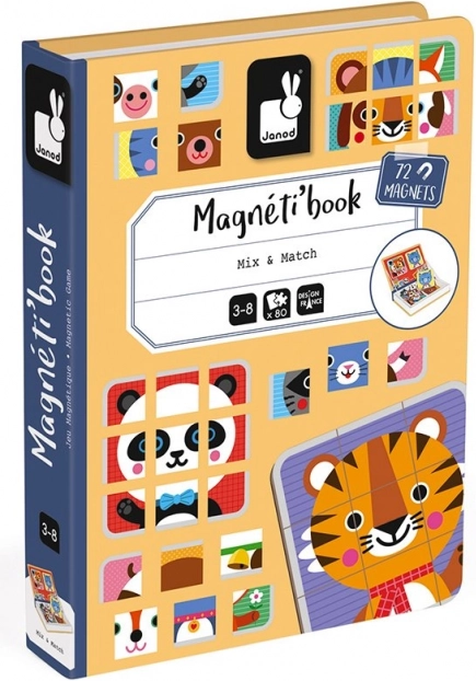 Praktyczne opakowanie ułatwia przenoszenie, dzięki czemu dzieci mogą bawić się nie tylko w domu, ale również w trakcie długich podróży. Zestaw zawiera 72 magnetyczne elementy i 8 kart z wzorami zwierzątek.