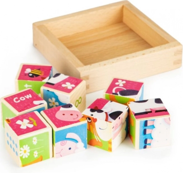 Ten zestaw 8 solidnych drewnianych klocków ECOTOYS zapewnia godziny wartościowej zabawy. Dzieci mogą ułożyć z nich 3 urocze obrazki – owieczkę, krowę i kotka – a jednocześnie poznawać ich angielskie nazwy. Ścianki z liczbami przedstawiają cyfry w trzech formach: arabskie cyfry, rzymskie cyfry oraz oczka jak na kostce do gry.
