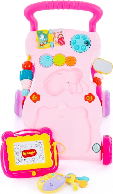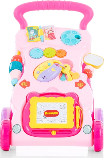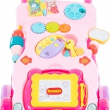 W zestawie znajduje się tablica do rysowania z pisakiem, lusterko, kolorowe kółka zębate, przyciski oraz kluczyki z „inteligentnym” pilotem. Odłączane zabawki można używać także osobno, co wydłuża zabawę i wspiera kreatywność. Chodzik odtwarza światła, melodie i dźwięki, stymulując słuch, wzrok i koncentrację. Zapakowany w pudełko prezentowe – świetny pomysł na prezent.