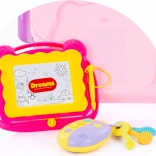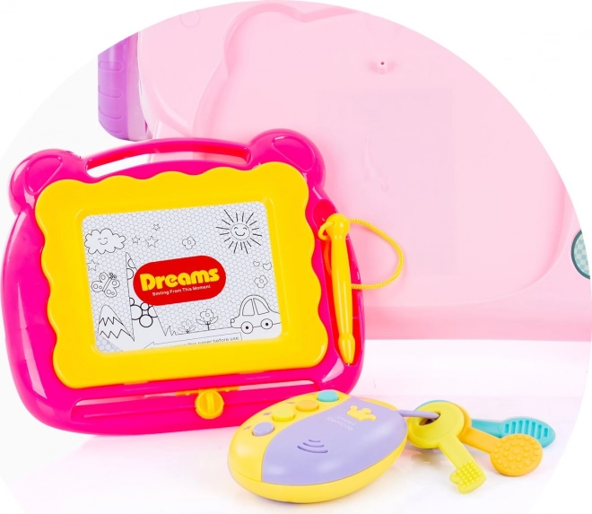 Tablica do rysowania z pisakiem, kółka zębate, przyciski, lusterko oraz kluczyki z pilotem rozwijają małą motorykę, wzrok i słuch.