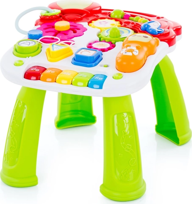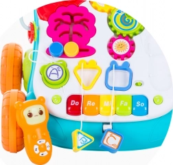 Stolik oferuje przyciski, przekładnie zębate i mini klawiaturę z nutkami, które wspierają małą motorykę, koordynację ręka–oko oraz poczucie rytmu.
