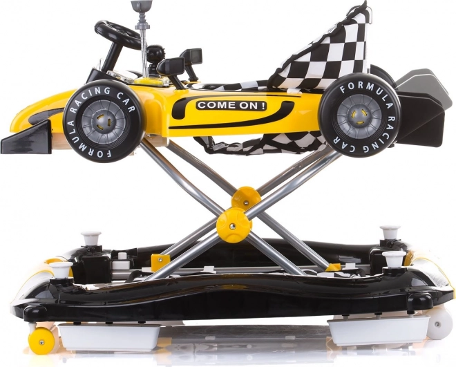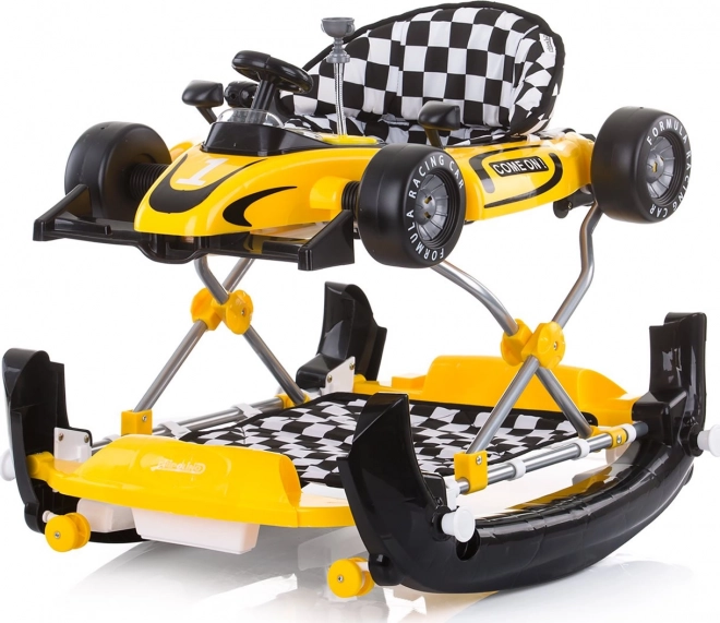 Wielofunkcyjny dziecięcy chodzik 4w1 inspirowany samochodem wyścigowym wspiera pierwsze kroki, koordynację i stabilność. Oferuje tryby chodzik, bujaczek, centrum zabaw oraz pchacz–autko, ma szeroką, stabilną podstawę, obrotowe przednie kółka 360° i odpinany panel zabaw ze światłami i dźwiękami wspierający rozwój zmysłów.