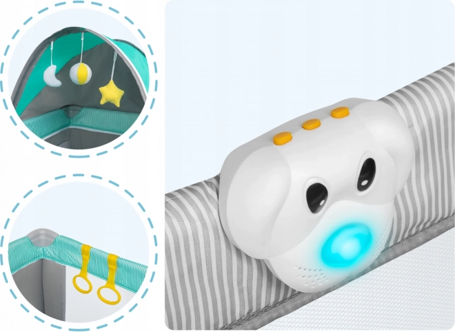 Bezpieczeństwo zwiększa system LockGuard, który zapobiega przypadkowemu złożeniu, oraz moskitiera dla spokojnego snu. W zestawie znajduje się także przewijak, boczny organizer z 3 kieszeniami oraz uchwyty do nauki wstawania. Wysokiej jakości miękka mata jest odporna na ścieranie, a certyfikat SGS potwierdza zgodność z normami UE.