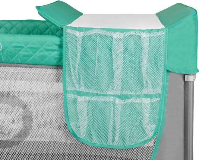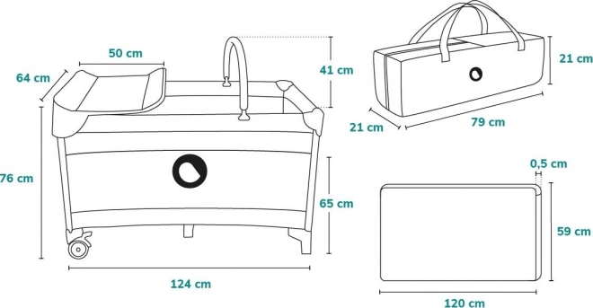 Bogaty zestaw akcesoriów obejmuje przewijak z podwyższonymi brzegami, praktyczny organizer na akcesoria, pałąk z materiałowymi zabawkami oraz boczne wejście na zamek, by dziecko mogło samodzielnie wchodzić. Piankowy materac 120 × 60 × 5 cm o podwyższonej sprężystości zapewnia komfort snu i odpoczynku. Bezpieczeństwo zwiększa blokada przed samoistnym złożeniem LockGuard oraz zgodność z normą EN 716 potwierdzona przez laboratorium SGS.